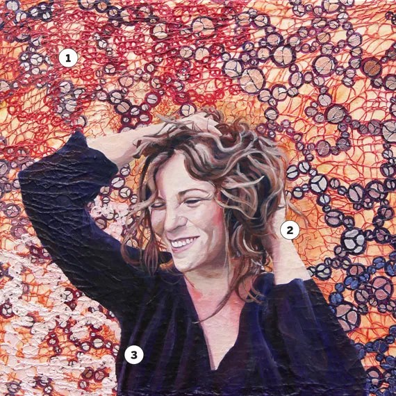 The real magic happens when Doering manipulates these textbook-esque images to reflect the person they’re about. Take these red, artery-like lines for example: They fan out just like the subject’s laugh lines, just like her loose curls of hair—and probably just like her laughter did in that moment.