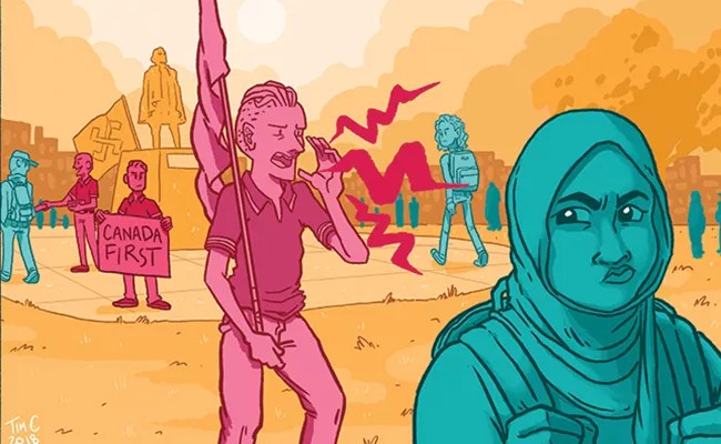 The rise of the alt-right has been seen across Canada in the past few years, says Khasnabish, and especially at universities. “Free speech” groups have formed on campuses at York, UBC, Concordia and other schools across the country. Last fall, the University of Toronto banned a white nationalist rally. Last spring, Dalhousie student Evan Jeddore was running an (unsuccessful) campaign for student union vice-president academic and external, championing free speech and denouncing diversity initiatives.