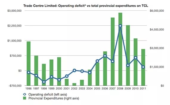 Even more insulting to the city is the financial arrangements etched out for running the new convention centre. See, up to now, the existing convention centre has been pretty much the province’s responsibility. The city pays a nominal annual subsidy that was worked out in the 1980s, with an inflator—in 1996, that subsidy was $430,290, which rose to $571,899 in 2011. But that’s it. Everything else–all cost overruns, all TCL deficits, all liabilities related to lawsuits should there be a horrific PowerPoint maiming incident, all additional TCL costs are the province’s responsibility. That’s why the province is shifting so much business over to the convention centre, agreeing to the back-door subsidy the financial statements show in the above chart.